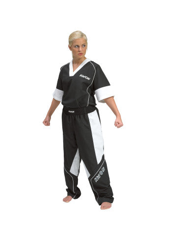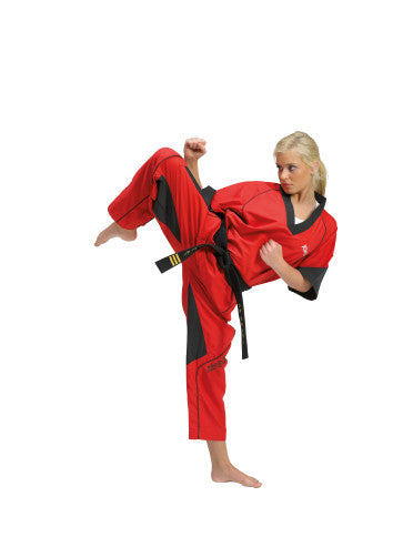 High performance fight uniform made of the latest Dry Fit material technology to help dry sweat and keep the air ventilation going. This brand new uniform features 3/4 length sleeves and pullover top. Pants come with 3" wide boxer style waistband with belt loops and kick gusset. Available in Red with black or Black with white.