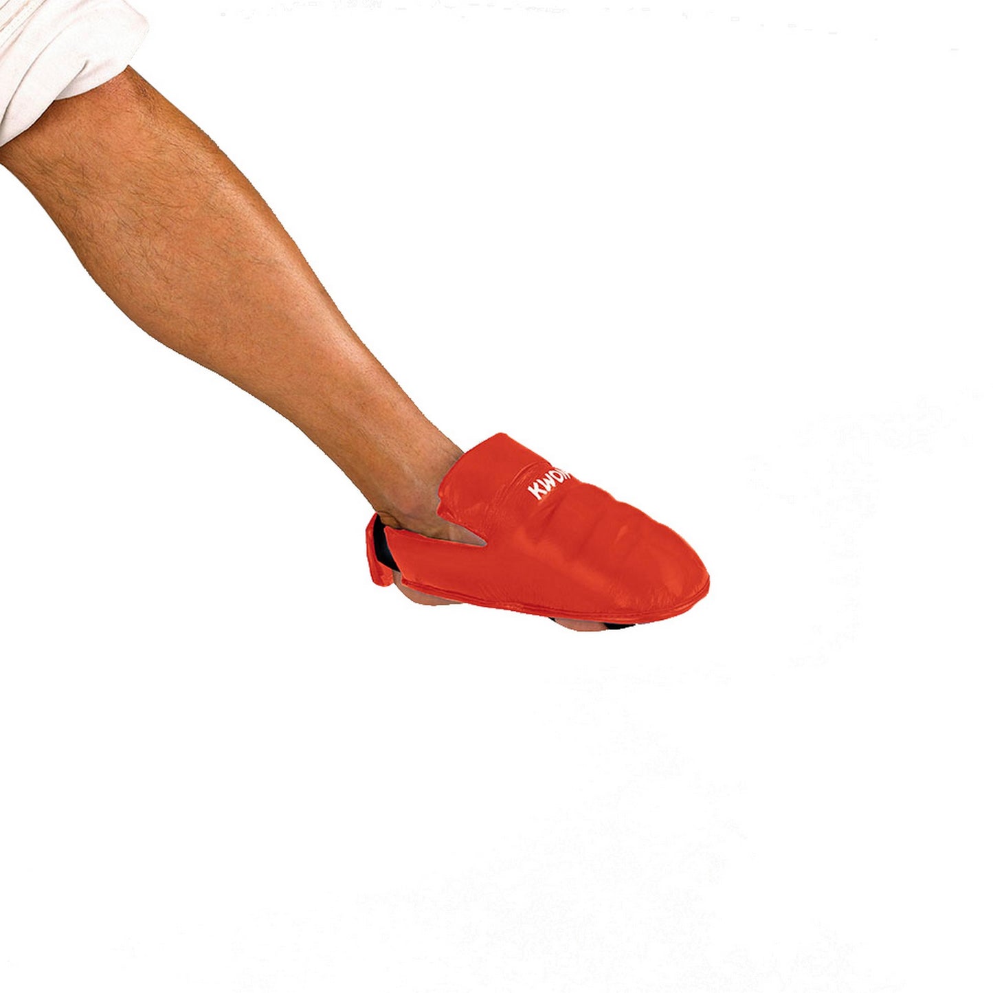 Made of a vinyl shell featuring foam inserts. Ergonomically shaped and perfect cushioning capacity. Can be connected easily to shin guard (sold separately) by means of hook and loop fasteners. Produced according to the WUKF regulations. Sold as a pair. Available in red, blue, or white (White is WUKF Approved). *Please note that the style of the product may vary between images 1 and 3.