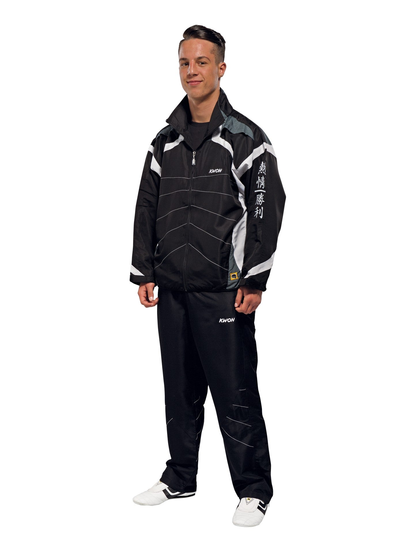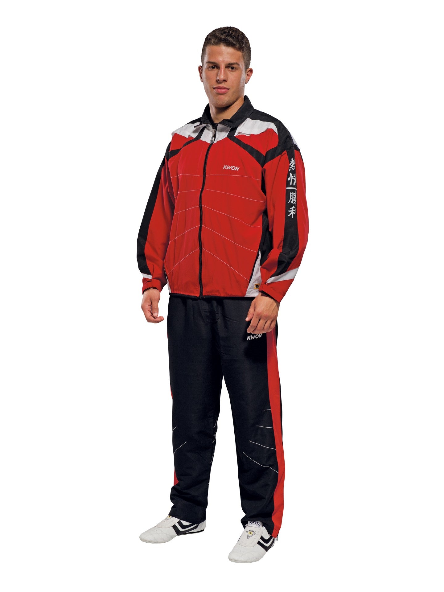 Eye-catching and very functional warm up suit made of breathable polyester material. Jacket features mesh lining; zippered side pockets; and cuffs with hook and loop closure as well as modern elastic waist. Pants come with open leg bottoms and side pockets. Chinese lettering on sleeve reads: "Victory and Passion." Available in red with white/black accents or black with white accents.
