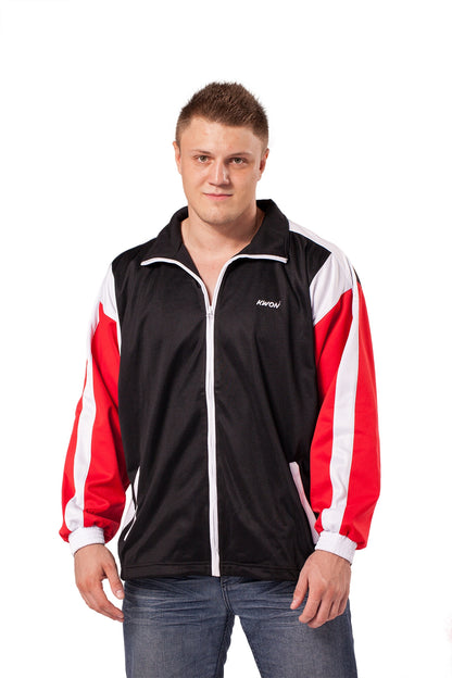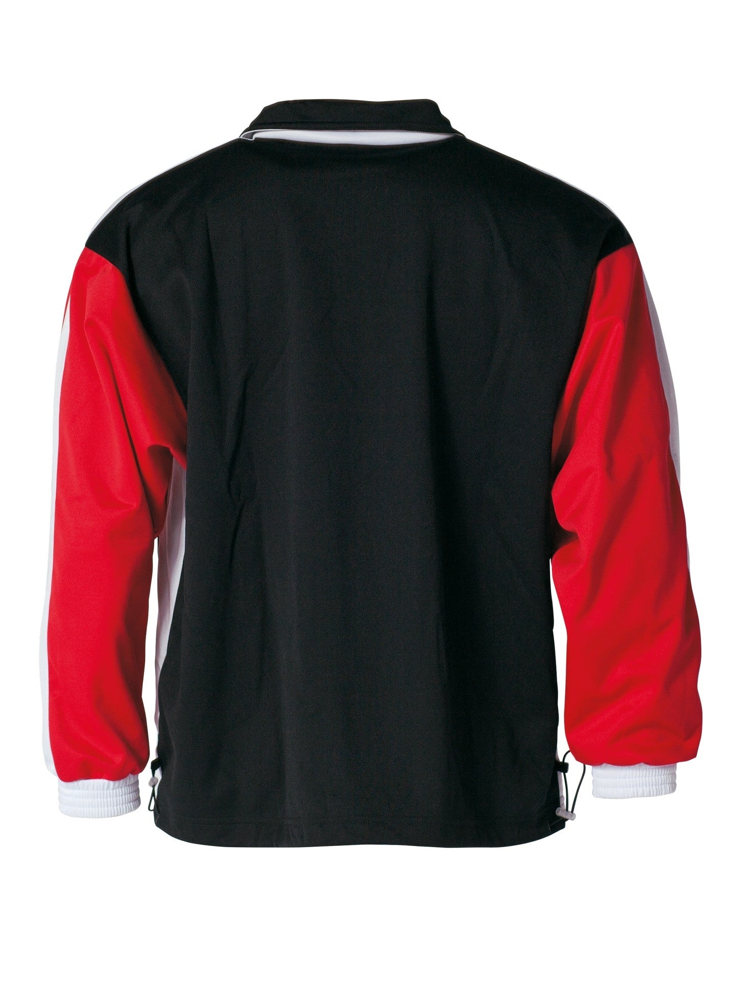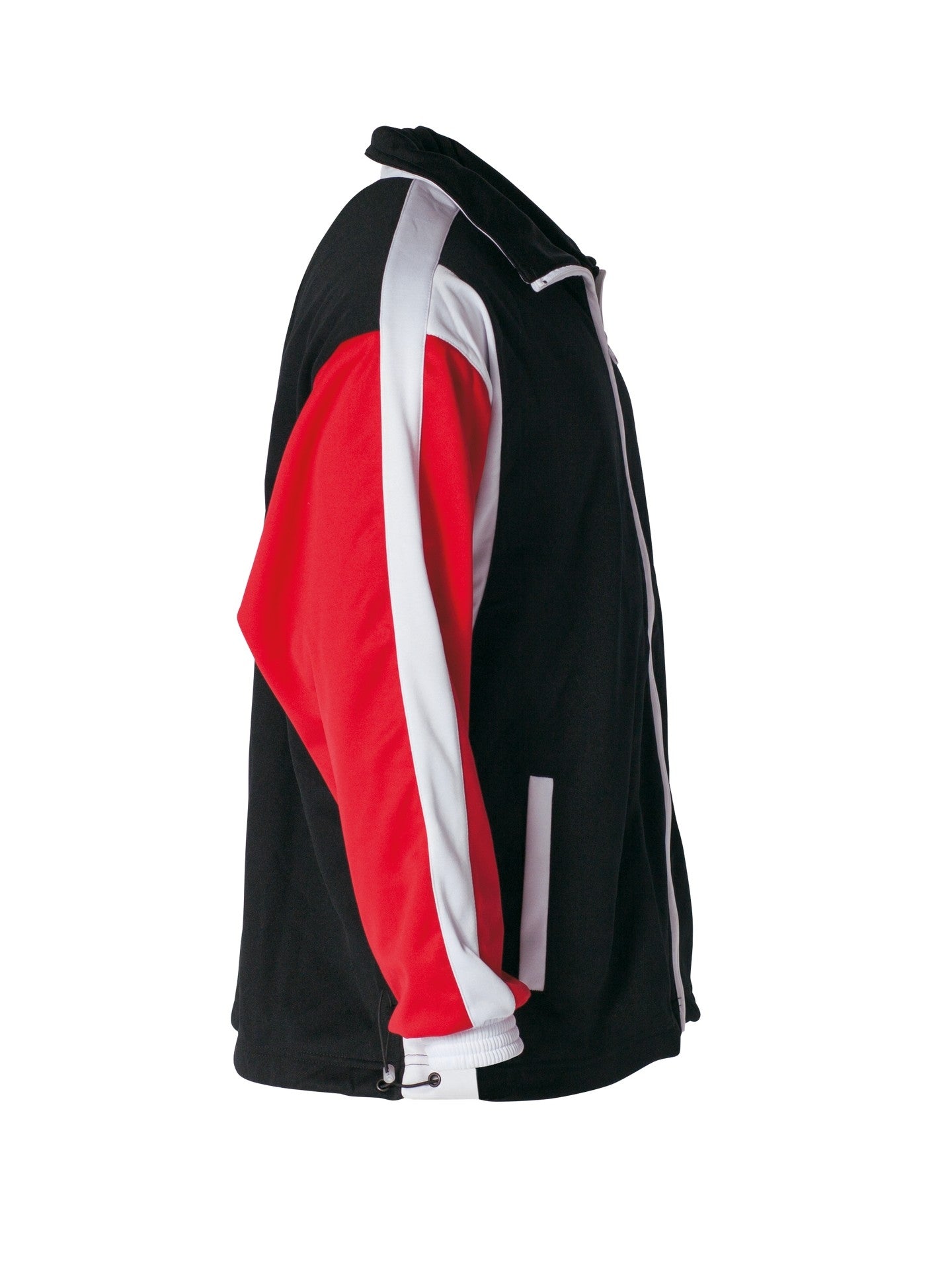Single warm up jacket made of heavy dull polyester material. Open jacket bottom with modern draw cord on sides. Zippered pockets. Great for team appearances, daily training, or street wear. Black with red and white sleeves.