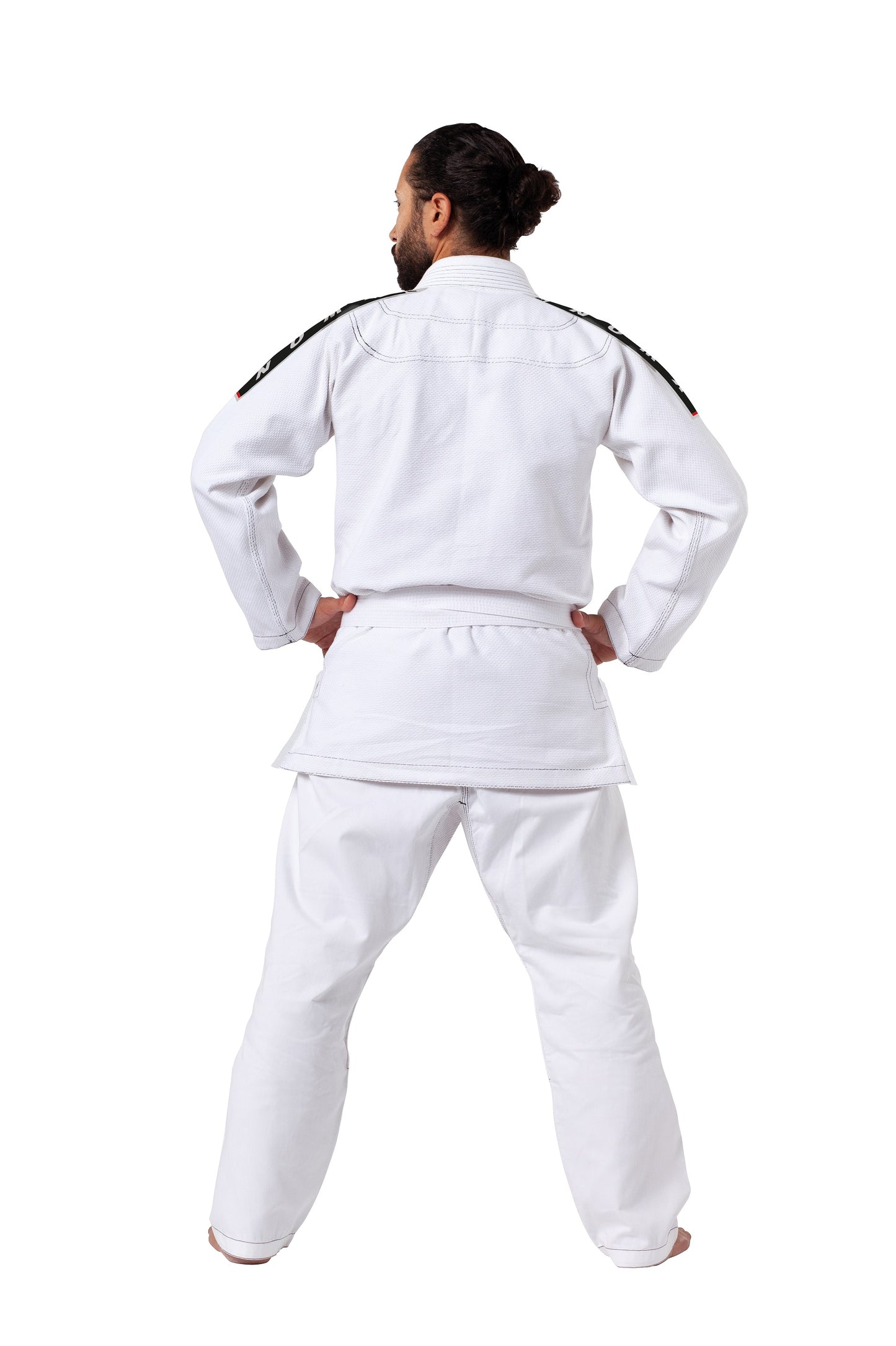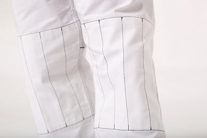 35% cotton, 65% polyester. Jacket made of 350 grams per square meter preshrunk premium pearl weave fabric. Pants made of durable twill fabric. Uniform features reinforced shoulders and knees, draw cord waistband, shoulder stripes and chest patch. Minimal shrinkage. We recommend washing in cold water and hang drying. Belt sold separately. Available in white with black contrast stitching, and in blue and in black with light gray contrast stitching.