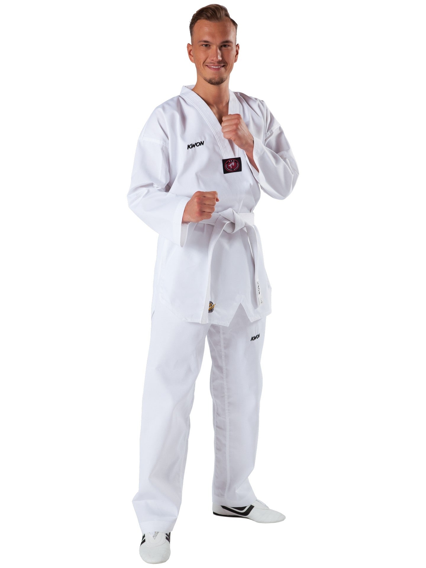 Great quality, middle-weight competition style uniforms featuring ribbed textured material, made of 45/55% poly cotton. These quality approved uniforms are produced according to the latest WT rules and specifications. Pull-over jackets feature side vents for easy airflow. Pants come with elastic waistband and additional drawstring. Black V-neck uniform is WT recognized. Belt not included.